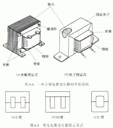 圖6-4 是一些小型電源變壓器的外形圖。它主要由鐵心、骨架、繞組、絕緣物及緊固件等組成。