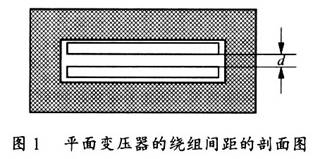 ??? 在平面型變壓器里,其“繞組”是做在印制電路板上的扁平傳導(dǎo)導(dǎo)線或是直接用銅泊。扁平的幾何形狀降低了開關(guān)頻率較高時趨膚效應(yīng)的損耗,也就是渦流損耗。因此,能最有效地利用銅導(dǎo)體的表面導(dǎo)電性能,效率要比傳統(tǒng)變壓器高得多。圖1給出了一個平面變壓器的剖面圖,并且利用兩層繞組間距離的不同,而獲得在不同間隙下的漏感和交流阻抗值。