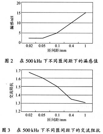 ??? 圖2與圖3給出了在不同的間隙下漏感和交流阻抗的變化,可以明顯地看出間隙越大,漏感越大,交流阻抗越小。在間隙增加1mm的狀況下漏感值增加了5倍之多。因此,在滿足電氣絕緣的情況下,應(yīng)該選用最薄的絕緣體來獲得最小的漏感值。