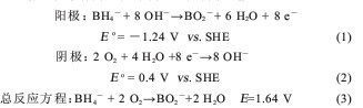 通過(guò)理論計(jì)算可以得出硼氫化鈉燃料電池的開(kāi)路電壓和?比能量分別為1.64?V和9?295?Wh/kg比甲醇的開(kāi)路電壓和比?能量分別高0.4?V和 3?200?Wh/kg[6]。