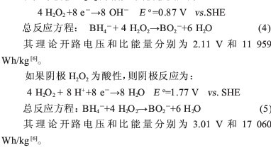 對(duì)于陰極用氧氣作為燃料的硼氫化鈉燃料電池,仍然存?在與甲醇燃料電池一樣的陰極氣體儲(chǔ)存攜帶不便的問(wèn)題,為?此,研究者提出了以H2O2代替O2的 NaBH4/H2O2燃料電?池[7-8]。如果陰極H2O2為堿性,則陰極反應(yīng)為: