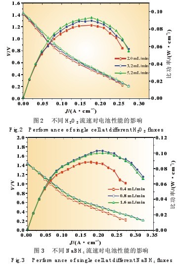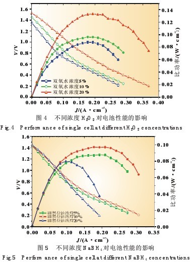 陽(yáng)極硼氫化鈉溶液采用NaBH4含量為10%,其中含有?5%NaOH,5%NH·3H2O;陰極雙氧水采用H2O2含量為10%,其?中含有 5%H3PO4。對(duì)于不同濃度的NaBH4和H2O2其中各組?分的比例與上面的配比一致。