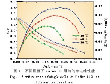 2.1溫度對(duì)直接硼氫化鈉燃料電池性能的影響?圖1是利用自制的電極和Nafion112膜組裝的電池在不?同溫度下的工作性能曲線。其陽(yáng)極NaBH4和陰極H2O2的濃?度均為10%,電池的陽(yáng)極陰極流速分別為0.8?mL/min,3.2?mL/min。從圖中可以看出,隨著溫度的升高,電池的最大比功?率有較大的提高,開(kāi)路電壓也同時(shí)有所提高。在40℃時(shí)電池?的開(kāi)路電壓為1.39?V,最大比功率為74?mW/cm2;當(dāng)溫度升高?至60℃,開(kāi)路電壓和最大比功率分別升高至1.42?V和99?mW/cm2;繼續(xù)升溫到80℃會(huì)使電池開(kāi)路電壓比40℃時(shí)提高?了60?mV,最大比功率可達(dá) 117?mW/cm2。