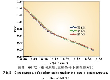 圖8為利用Nafion112制作的電池在60℃下相同濃度?(陽(yáng)極NaBH4:10%,陰極H2O2:10%)、流速(陽(yáng)極 NaBH4:?0.8?mL/min,陰極H2O2:3.2?mL/min)下幾次不同實(shí)驗(yàn)的對(duì)比,