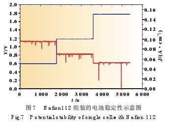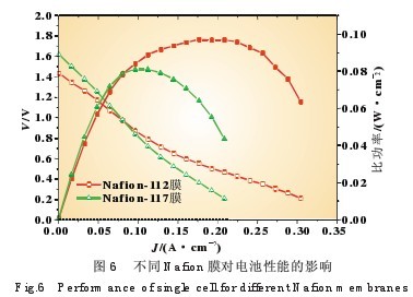 圖6是在相同的工作條件下(60℃;陽(yáng)極NaBH4濃度為?10%,流速0.8?mL/min;陰極H2O2濃度為10%,流速3.2?mL/min)分別用Nafion112(厚度50μm)和Nafion117(厚度?175μm)制作的電池性能比較。從圖中可以看出,隨著Nafion膜厚度的增加,電池的開(kāi)路電壓升高,這主要是由于低電流密?度下NaBH4滲透對(duì)電池性能起主要作用,隨著膜厚度的增加?NaBH4滲透逐漸減少,陰極極化減少,從而使陰極電極電位升?高,導(dǎo)致電池開(kāi)路電壓升高。然而隨著放電電流密度的增加,?NaBH4滲透產(chǎn)生的陰極極化不再起主要作用,而Nafion膜本?身的膜電導(dǎo)成為控制電池性能的主要因素,Nafion膜越薄則?膜電阻也越小,從而電池性能越好。