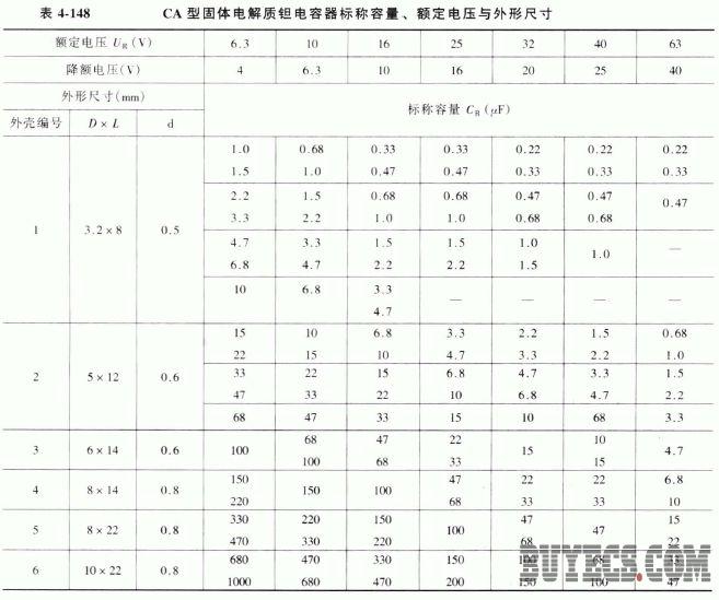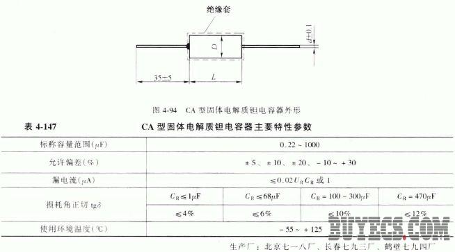CA 型固體電解質鉭電容器為金屬外殼全密封結構,具有電氣性能穩(wěn)定、可靠性高、工作溫度范圍寬、使用壽命長等特點,適用于各種軍用及通信電子設備。其外形如圖4-94 所示,主要特性參數見表4-147 -表4-149 。