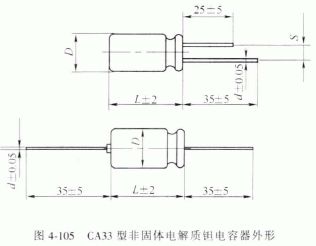 CA33 型高壓非固體電解質(zhì)鈕電容器采用多芯結(jié)構(gòu).具有工作電壓高、性能穩(wěn)定可靠的特點(diǎn),適用于直流或脈動電路,其外形見圖4-105。