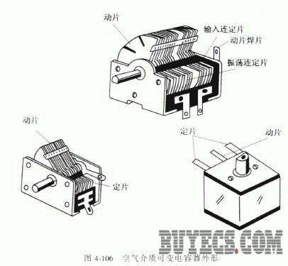 空氣介質(zhì)可變電容器是由一組固定不動(dòng)的定片和可以旋轉(zhuǎn)的一組動(dòng)片構(gòu)成的,動(dòng)片和定片之間的絕緣介質(zhì)為空氣,如圖4-106 所示。由于轉(zhuǎn)軸和動(dòng)片相連,旋轉(zhuǎn)轉(zhuǎn)軸即可改變動(dòng)片與定片之間的角度,從而可以改變電容量的大小。當(dāng)動(dòng)片從定片位置全部旋出時(shí),電容量最小;當(dāng)動(dòng)片全部旋人定片位置時(shí),電容量最大。電容器的容量取決于兩組極片間的距離和極片面積的大小。