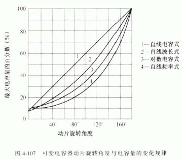 為了適應(yīng)不同應(yīng)用場合的要求,空氣可變電容器的動(dòng)片常作成不同的形狀,常見的有直線電容式、直線被長式、直線頻率式及對(duì)數(shù)電容式等形式。可變電容的動(dòng)片形狀及其對(duì)應(yīng)的容量變化規(guī)律如圖4-107 所示。