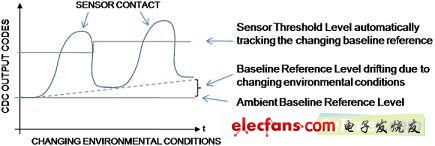 保持可靠性能。容性傳感器電極是采用PCB上的標(biāo)準(zhǔn)銅材料或柔性材料制成的。這種材料的特性會隨溫度和濕度的變化而發(fā)生改變。這種變化會使基線電平發(fā)生偏移(所有傳感器閾值電平均是以基線電平為參考的)。較大的基線偏移增加了接觸閾值電平過低或過高的風(fēng)險(過低還是過高取決于基線偏移的方向)這會引起虛假的接觸誤差,或使閾值電平不是太靈敏就是不夠靈敏,導(dǎo)致接觸狀態(tài)的不穩(wěn)定。為保持傳感器原始的信號接觸閾值檢測電平余量(靈敏度),CDC需要自動跟蹤基線偏移誤差的幅度,并對閾值設(shè)置進(jìn)行相應(yīng)的重新調(diào)整。圖2中的示例介紹了AD7147和AD7148的閾值電平如何針對因環(huán)境條件變化引起的基線失調(diào)變化進(jìn)行自動跟蹤和調(diào)整。