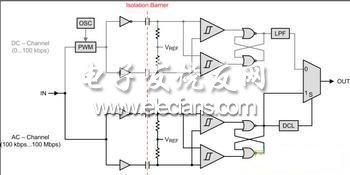 圖 1 顯示了一款數(shù)字電容隔離器?(DCI) 的內(nèi)部結(jié)構(gòu)圖。該隔離器輸入分為兩個差分信號路徑:一條為高數(shù)據(jù)速率通道(稱作 AC-通道),另一條為低數(shù)據(jù)速率通道(稱作 DC-通道)。AC-通道傳輸介于 100 kbps 和 100 Mbps 之間的信號,而DC-通道則涵蓋了從 100 kbps 到 DC 的范圍。