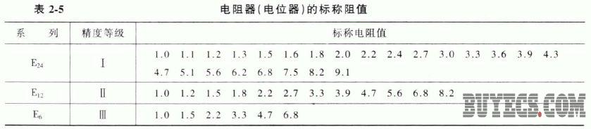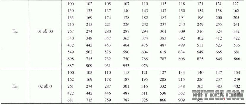為了滿足使用者的要求,生產(chǎn)廠生產(chǎn)了各種阻值的電阻器。即使如此,也無法做到使用者想要什么樣阻值的電阻器就會有什么樣電阻器的成品。為了便于生產(chǎn)和使用,國家統(tǒng)一規(guī)定了一系列阻值作為電阻器阻值的標準值,這一系列阻值叫做電阻的標稱阻值。表2-5 和表2-6 列出了常用電阻器的阻值系列標準。線繞或非線繞固定電阻器的標稱阻值應符合表2-5和表2-6 中所列數(shù)值之一,或是表中所列數(shù)值再乘以10 n , 其中n為O或正數(shù)。