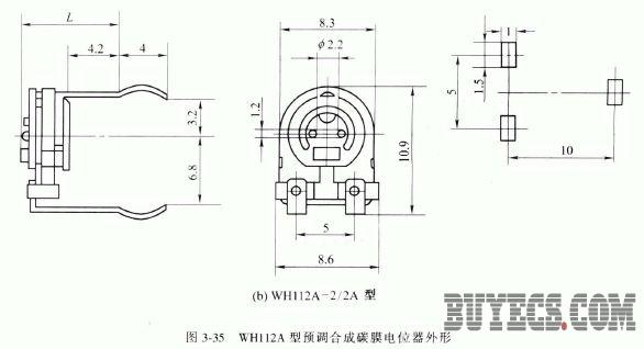 2. WH112A 型預調合成碳膜電位器WH112A 型系列預調合成碳膜電位器的外形如圖3-35 所示,它們的主要參數(shù)見表3-30。