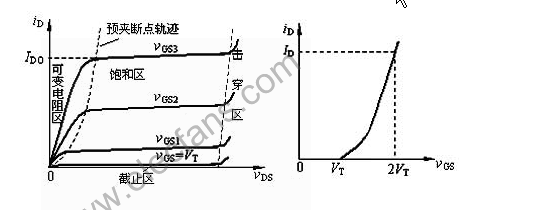 與結(jié)型場(chǎng)效應(yīng)管相類似。在飽和區(qū)內(nèi),iD與vGS的近似關(guān)系式為