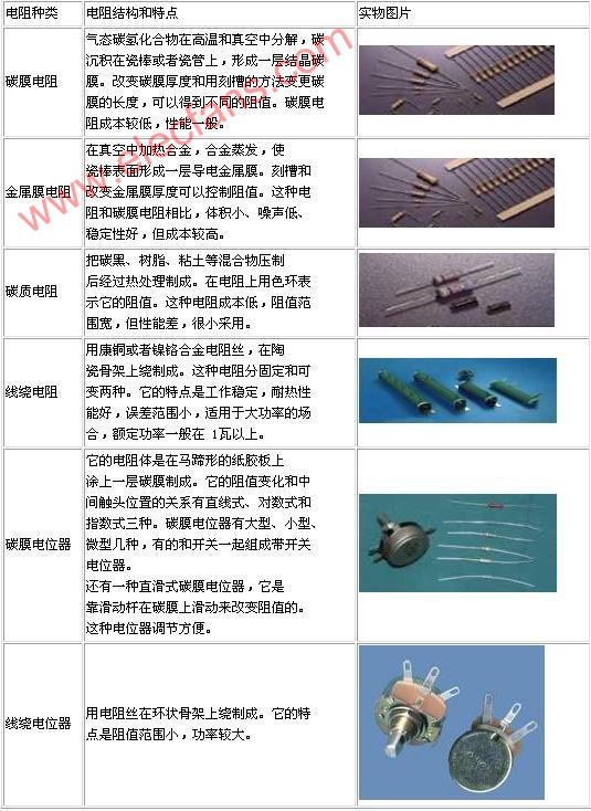在電子電路中常用的電阻器有固定式電阻器和電位器,按制作材料和工藝不同,固定式電阻器可分為:膜式電阻(碳膜 RT、金屬膜RJ、合成膜RH和氧化膜RY)、實芯電阻(有機 RS和無機RN)、金屬線繞電阻(RX)、特殊電阻(MG型光敏電阻、MF型熱敏電阻)四種。