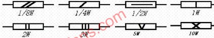 額定功率:在規(guī)定的環(huán)境溫度和濕度下,假定周圍空氣不流通,在長期連續(xù)負載而不損壞或基本不改變性能的情況下,電阻器上允許消耗的最大功率。為保證安全使用,一般選其額定功率比它在電路中消耗的功率高1-2倍。額定功率分19個等級,常用的有 0.05W、0.125W、0.25W、0.5W、1W、2W、3W、5W、7W、10W,在電路圖中非線繞電阻器額定功率的符號表示如下圖: