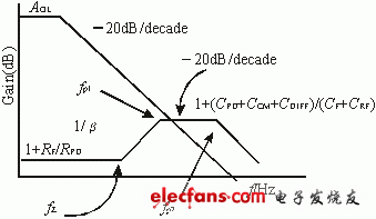 1/b 網(wǎng)絡(luò)的極點(diǎn)設(shè)計(jì)成1/b 與放大器的開環(huán)增益曲線相交的那一點(diǎn)。此時(shí)頻率就是這兩條曲線的幾何平均值。CF可計(jì)算如下