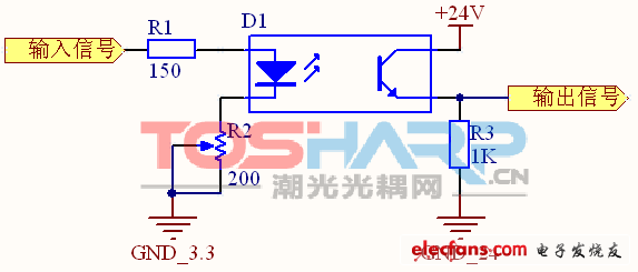 輸入信號(hào)由FPGA提供,高電平3.3V,輸出為24V系統(tǒng)。考慮到光耦輸入很多是由單片機(jī)之類的提供,其驅(qū)動(dòng)電流有限,最大的也就十幾毫安,因此測(cè)試是選用10mA的輸入電流,因不同光耦的壓降不同,需通過可調(diào)電位器R2進(jìn)行微調(diào)。一般晶體管輸出(不包括達(dá)林頓輸出,關(guān)于該類型光耦后文有討論)的光耦輸出電流可到50mA,在測(cè)試中我們?cè)谳敵龆舜弦恢?k的電阻,然后施加24V的電壓,此時(shí)的負(fù)載電流約23mA,接近標(biāo)稱值的一半。