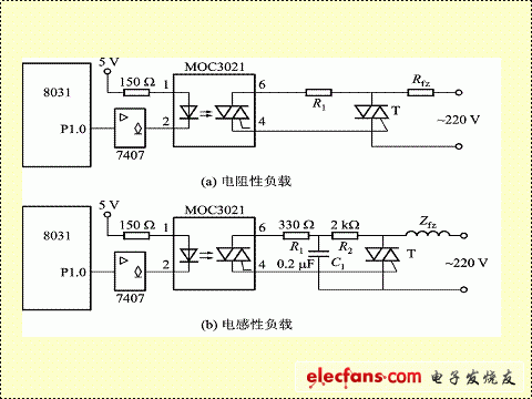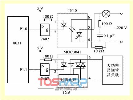 采用單片機I/O口灌電流的方法控制晶閘管實現(xiàn)開關(guān)和調(diào)光控制。用內(nèi)部帶有過零檢測電路的光電耦合器MOC3041作為晶閘管的驅(qū)動器,同時能實現(xiàn)強、弱電的隔離。