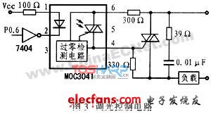 ??? MOC3041內(nèi)部含有過零檢測電路,當輸入引腳1輸入15mA的電流,輸出端6引腳、4引腳之間的電壓稍過零時,內(nèi)部雙向晶閘管導通,觸發(fā)外部晶閘管導通,當MOC3041輸入引腳輸入電流為0時,內(nèi)部雙向晶閘管關(guān)斷,從而外部晶閘管也關(guān)斷,其調(diào)光控制電路如圖3所示。
