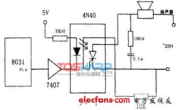 單片機處理完數(shù)據(jù)后,發(fā)出控制信號控制外電路工作,開關(guān)型驅(qū)動接口中單片機控制輸出的信號是開關(guān)量,有發(fā)光二極管驅(qū)動接口,光電耦合器驅(qū)動接口,液晶顯示器驅(qū)動接口,晶閘管輸出型驅(qū)動接口和繼電器型驅(qū)動接口。控制揚聲器采用的是晶閘管輸出型光電耦合驅(qū)動接口。