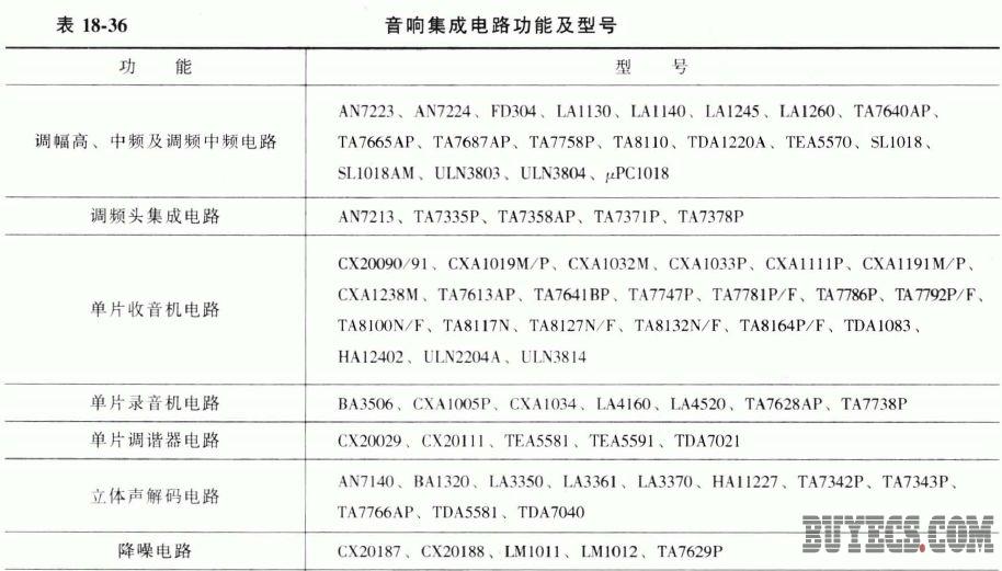 表18-36 列出了常用音響集成電路的功能及型號,供使用時參考。
