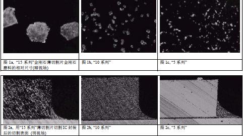 圖1 示出不同金剛石切割片中金剛石磨料的相對(duì)尺寸。圖2 示出硅晶片切割表面的明視場(chǎng)顯微組織照片。由圖2c 可以看出,使用5LC 金剛石薄切割片可以獲得最佳切割效果,但是在有些情況下,使用較細(xì)的磨料可能會(huì)使切割時(shí)間顯著增長(zhǎng)。為了切割I(lǐng)C 封裝,10LC 系列切割片在合理的切割時(shí)間內(nèi)能給出滿意的結(jié)果。