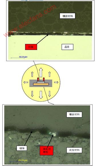 (2) 低收縮(或劈裂)---冷鑲嵌材料固化時(shí)會(huì)產(chǎn)生收縮。這時(shí)在鑲嵌材料與試樣之間會(huì)產(chǎn)生縫隙,在試樣進(jìn)行磨光時(shí),一些磨料(例如砂紙上的碳化硅顆粒)就可能會(huì)嵌入此縫隙中,在下一道工序中,這些磨料顆粒又會(huì)被拖出而在試樣表面上產(chǎn)生一條深劃痕;另一種情況,如果鑲嵌材料與IC 封裝成型材料之間的粘合是如此地好,以至于IC 封裝的成型材料會(huì)被拉出而在成型材料與硅晶片之間產(chǎn)生縫隙。這一情況有點(diǎn)看起來似乎有點(diǎn)不尋常,但是對(duì)于“薄”的IC 封裝(例如BGA 或TSOP),還是有可能產(chǎn)生的。如果這種情況的確發(fā)生,我們就無法斷定它是原有的缺陷還是試樣制備缺陷 (參看圖3)