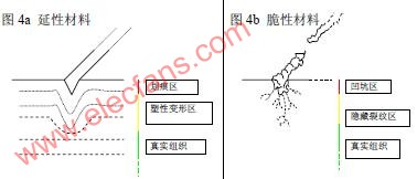 (2) 脆性破壞 --- 產(chǎn)生于脆性材料,例如陶瓷、硅晶片等。其表面形成一些凹坑和裂紋。對(duì)于陶瓷封裝,出現(xiàn)凹坑是一種良好的征兆,表示我們可以進(jìn)行到下一道工序。如果凹坑的尺寸變得越來越小,表明我們正在去除損傷層。由于陶瓷封裝是用燒結(jié)方法生產(chǎn)的,孔隙和孔洞就是原始組織的一部分。如果孔隙或凹坑的尺寸在重復(fù)同一工序數(shù)次后仍舊不變,這就意味著損傷層已經(jīng)去除,我們就可以進(jìn)行下一道工序了 (參看圖4b)
