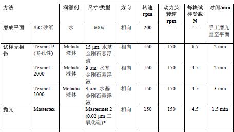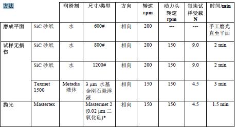 一般情況下,常規(guī)試樣制備方法是從240#碳化硅砂紙開始,先進(jìn)行磨成平面工序,接著使用600#、1200#砂紙,然后用0.3 μm 氧化鋁進(jìn)行粗拋光,以及0.05 μm 氧化鋁在長(zhǎng)絨毛織物上進(jìn)行最終拋光,這樣可獲得光亮的表面。制備方法還可能因地而異,甚至還取決于實(shí)驗(yàn)室有哪些現(xiàn)成的消耗器材。當(dāng)今,這種制備方法已經(jīng)不適于用來制備先進(jìn)材料。此外,他們也沒有想到他們的試樣是否好到足以和先進(jìn)的顯微鏡或掃描電子顯微鏡相匹配。