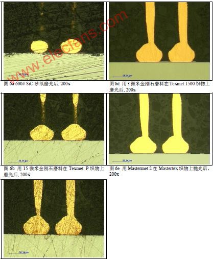 (1) 不要期望能夠?qū)⑺械膭澓廴コ?br>在高度不均勻的封裝材料中,當(dāng)硬材料中的劃痕去除后,軟材料中又會(huì)形成少量劃痕,去除這些劃痕是非常困難的。即使絕大部分區(qū)域都制備得相當(dāng)完美,在金引線上還會(huì)有少量細(xì)劃痕,可以在高放大倍數(shù)的顯微鏡下看到。