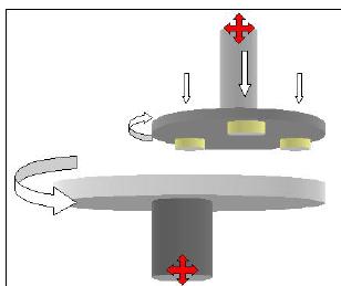 白色直箭頭表示加在試樣上的壓力; 白色彎曲箭頭表示轉(zhuǎn)盤與拋光頭的轉(zhuǎn)動(dòng)動(dòng)作; 紅色十字箭頭表示振動(dòng)和抖動(dòng)動(dòng)作