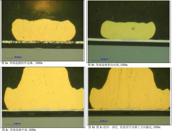 從圖8a 導(dǎo)線連接的外邊緣可以看出,此處輪廓看不到金屬間化合物層。圖8b中,另一試樣的導(dǎo)線連接更向內(nèi)部分,可以看到一層厚度非常均勻的金屬間化合物層,其形狀相當(dāng)完整。到了圖8c,如果再往深磨下去,金屬間化合物層就不再象圖8b 所示的那樣完整,有些區(qū)域呈不連續(xù)狀,厚度也不那么均勻。有人可能會(huì)認(rèn)為金屬間化合物產(chǎn)生了塑性流變并脫落,使其厚度不均勻。然而,根據(jù)從一點(diǎn)得出結(jié)論認(rèn)為試樣制備不好也不公平。我們是用相同的方法在同一臺(tái)設(shè)備上制備從圖8a 至圖8c 所示的試樣,如果的確發(fā)生了塑性流變,那么圖8b 中的試樣也應(yīng)當(dāng)會(huì)發(fā)生,其厚度就不會(huì)象我們所看到的那樣均勻。此外,象圖7a 和圖7b 所示的導(dǎo)線連接分別是圖6e 左側(cè)和右側(cè)的導(dǎo)線連接。這兩個(gè)導(dǎo)線連接彼此相鄰,并且使用相同的導(dǎo)線連接設(shè)備來制作這個(gè)IC,如果發(fā)生了塑性流變和脫落,至少金屬間化合物層的形狀應(yīng)當(dāng)是相似的。然而,二者的形狀卻很不相同。從這一事實(shí)我們可以推測(cè),金屬間化合物層的厚度和形狀對(duì)于不同的連接和不同的輪廓都是不相同的。
