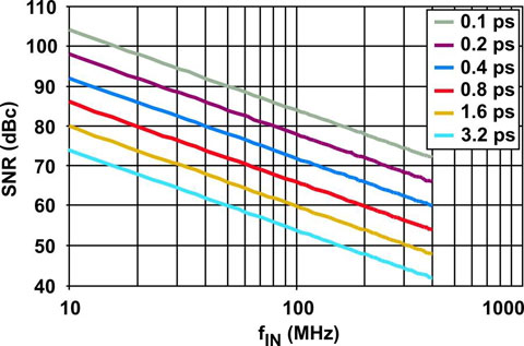 在該方程式中,fIN 為轉換器的輸入信號頻率。另外,tJITTER-TOTAL 為時鐘信號和ADC時鐘輸入電路的 rms 抖動。請注意,fIN 并非時鐘頻率 (fCLK)。外部時鐘器件到 ADC 的 1 微微秒抖動適合于一些而不是所有高速 ADC 應用,如圖 1 所示。
