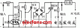 工作時(shí)只要在A、B上加上一定的控制信號(hào),就可以控制C、D兩端之間的“通”和“斷”,實(shí)現(xiàn)“開關(guān)”的功能,其中耦合電路的功能是為A、B端輸入的控制信號(hào)提供一個(gè)輸入/輸出端之間的通道,但又在電氣上斷開SSR中輸入端和輸出端之間的(電)聯(lián)系, 以防止輸出端對(duì)輸入端的影響,耦合電路用的元件是“光耦合器”,它動(dòng)作靈敏、響應(yīng)速度高、輸入/輸出端間的絕緣(耐壓)等級(jí)高;由于輸入端的負(fù)載是發(fā)光二極管,這使SSR的輸入端很容易做到與輸入信號(hào)電平相匹配,在使用可直接與計(jì)算機(jī)輸出接口相接,即受“1”與“0”的邏輯電平控制。觸發(fā)電路的功能是產(chǎn)生合乎要求的觸發(fā)信號(hào),驅(qū)動(dòng)開關(guān)電路④工作,但由于開關(guān)電路在不加特殊控制電路時(shí),將產(chǎn)生射頻干擾并以高次諧波或尖峰等污染電網(wǎng),為此特設(shè)“過零控制電路”。所謂“過零”是指,當(dāng)加入控制信號(hào),交流電壓過零時(shí),SSR即為通態(tài);而當(dāng)斷開控制信號(hào)后,SSR要等待交流電的正半周與負(fù)半周的交界點(diǎn)(零電位)時(shí),SSR才為斷態(tài)。這種設(shè)計(jì)能防止高次諧波的干擾和對(duì)電網(wǎng)的污染。吸收電路是為防止從電源中傳來的尖峰、浪涌(電壓)對(duì)開關(guān)器件雙向可控硅管的沖擊和干擾(甚至誤動(dòng)作)而設(shè)計(jì)的,一般是用“R-C”串聯(lián)吸收電路或非線性電阻(壓敏電阻器)。圖2是一種典型的交流型SSR的電原理圖。