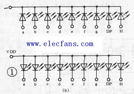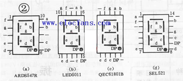 三、測(cè)試:同測(cè)試普通半導(dǎo)體二極管一樣。注意!萬(wàn)用表應(yīng)放在R×10K檔,因?yàn)镽×1K檔測(cè)不出數(shù)碼管的正反向電阻值。對(duì)于共陰極的數(shù)碼管,紅表筆接數(shù)碼管的“-”,黑表筆分別接其他各腳。測(cè)共陽(yáng)極的數(shù)碼管時(shí),黑表筆接數(shù)碼管的vDD,紅表筆接其他各腳。另一種測(cè)試法,用兩節(jié)一號(hào)電池串聯(lián),對(duì)于共陰極的數(shù)碼管,電池的負(fù)極接數(shù)碼管的“-”,電池的正極分別接其他各腳。對(duì)于共陽(yáng)極的數(shù)碼管,電池的正極接數(shù)碼管的VDD,電池的負(fù)極分別接其他各腳,看各段是否點(diǎn)亮。對(duì)于不明型號(hào)不知管腳排列的數(shù)碼管,用第一種方法找到共用點(diǎn),用第二種方法測(cè)試出各筆段a-g、Dp、H等。