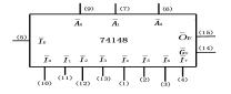 如圖所示的是八線-三線編碼器74148的慣用符號及管腳圖引腳圖。