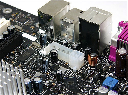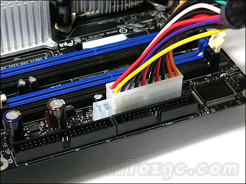 20針電源安裝到上面,會(huì)空出4個(gè)接口。如果您熟悉服務(wù)器產(chǎn)品的話應(yīng)該都知道,這種24針接口電源一直用在服務(wù)器上,現(xiàn)在915/925平臺(tái)把它引進(jìn)過(guò)來(lái),應(yīng)該是為了PCI Express X16接口做電源供應(yīng)。根據(jù)資料來(lái)看,PCI Express X16接口最高可以應(yīng)用75W功耗的顯卡,其中一部分電力應(yīng)該就是由這種服務(wù)器電源額外提供的。