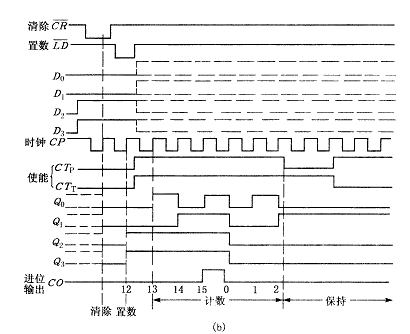 ???計(jì)數(shù)器選用集成電路74LS163進(jìn)行設(shè)計(jì)較簡(jiǎn)便。74LS163是4位二進(jìn)制同步計(jì)數(shù)器,它具有同步清零、同步置數(shù)的功能。74LS163的外引線排列圖和時(shí)序波形圖如圖12、3所示,其功能表如表12、2所示。圖中, 是低電平有效的同步清零輸入端, 是低電平有效才同步并行置數(shù)控制端,CTp、CTT是計(jì) 圖12、2 交通燈的ASM圖數(shù)控制端,CO是進(jìn)位輸出端,D0~D3是并行數(shù)據(jù)輸入端,Q0~Q 3是數(shù)據(jù)輸出端。由兩片74LS163級(jí)聯(lián)組成的定時(shí)器電路如圖12、4所示。電路的工作原理請(qǐng)自行分析。