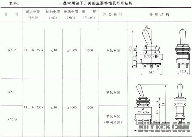 鈕子開關(guān)具有安裝容易、操作方便、接觸可靠等特點,適合在家用電器、儀器儀表及各種電子設(shè)備中作通斷電源和換接電路之用。鈕子開關(guān)的極位通常為單極雙位或雙極雙位。表9-1列出了一些鈕子開關(guān)的主要特性及外形結(jié)構(gòu)。