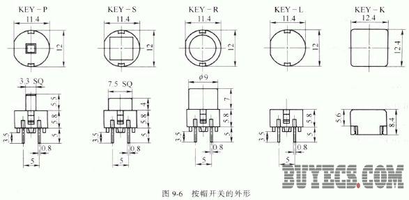 按帽開關(guān)屬微型按鈕式開關(guān),它具有行程短、手感輕的特點,適合在各種電子裝置的數(shù)字電路中作為復(fù)位開關(guān)等。它的外形有多種,如圖9-6 所示,其主要特性參數(shù)見表9-7。