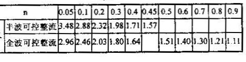 根據(jù)同樣的道理,可得出全波可控整流電路中,對(duì)應(yīng)于不同n值(可控硅全導(dǎo)通時(shí)n取得最大值0.9)時(shí)的波形系數(shù)K。