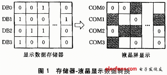 DDRAM用來存放液晶的顯示數(shù)據(jù)。它是一個65行、132列的地址空間。65行構(gòu)成了9頁,其中前8頁是由8列構(gòu)成(DB0~DB7),第9頁是單獨一行(只有DB0)。顯示數(shù)據(jù)DB0~DB7通過單片機的數(shù)據(jù)口送入,并通過DB0~DB7直接讀或?qū)懙矫宽搶?行;同時每一點陣可通過確定頁地址和列地址來確定位置。在向DDRAM中寫數(shù)據(jù)的同時,液晶屏上對應的點陣被顯示,如圖1所示。