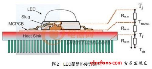 LED燈從芯片開始發(fā)熱,至散熱裝置把熱散掉,整個(gè)熱傳示意圖如圖2。前段從LED芯片到LED底座與LED封裝設(shè)計(jì)有關(guān),所以選擇耐溫的芯片、熒光粉、封裝材質(zhì)以及熱阻低的封裝設(shè)計(jì)便是首要要件,目前熱阻一般均可達(dá)10K/W以下,較好的技術(shù)已經(jīng)有達(dá)到5K/W的水平。而后段LED底座到空氣端則與散熱機(jī)構(gòu)有關(guān)。