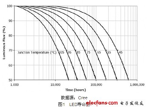 LED芯片可承受的最高溫約為125~150℃。在LED路燈應(yīng)用上,環(huán)境溫度可達(dá)35℃以上,甚至高溫區(qū)域40℃以上,若不能有效散熱(控制結(jié)點(diǎn)溫度),LED的壽命將快速遞減。根據(jù)Cree的數(shù)據(jù)顯示(圖1),若可將發(fā)光芯片結(jié)點(diǎn)溫度控制于65℃,LED的整體壽命將可達(dá)10萬小時(shí)(以光衰30%計(jì)算)。