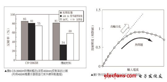 圖6是“CS-3965H”經(jīng)過(guò)加熱與紫外線照射后的藍(lán)光反射率變化特性,如圖所示CS-3965H銅箔白色積層板的變色非常低,由于CS-3965H的初期反射率很高,熱與紫外線照射后的反射率變化卻非常低,非常適用于高輝度LED的封裝。