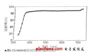 圖5是日本業(yè)者開(kāi)發(fā)的粘貼銅箔白色積層板“CS-3965H”的分光反射率。如圖所示CS-3965H的分 光反射率,從近紫外(波長(zhǎng)420nm)開(kāi)始站立,在可視光全波長(zhǎng)領(lǐng)域達(dá)到87%。如果基板變色時(shí),在藍(lán)光領(lǐng)域(波長(zhǎng)450nm)的反射率會(huì)降低。