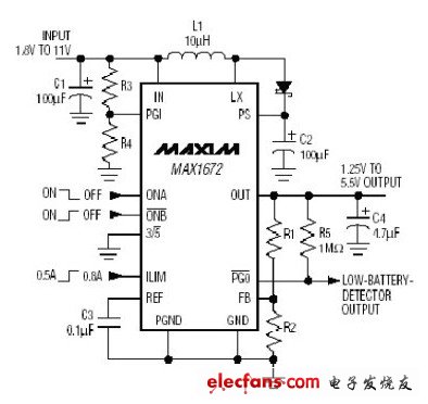 從 上述的式子可得知輸出電壓與輸入電壓和周期的關系,想得到較高或較低的輸出電壓只要控制 1/1-D 的比值大小即可。設計者也可以直接使用一組 Buck/Boost 電源 IC ,來產生所需的電壓輸出,如圖 2 便是一組直接昇降壓的 IC 。其結合一組升壓轉換器與線性穩(wěn)壓器來提供可升壓也可降壓的電壓轉 換器。這個轉換器為輸出電壓以下和超出的輸入提供一個穩(wěn)定的輸出電壓。它可從 1.8V 到 11V 輸入范圍和預置 3.3V 或者 5V 的輸出。也能夠把這個輸出電 壓使用兩個電阻分壓從 1.25V 至 5.5V ,其效率大致上可高達 85% 。如果需要的輸出電壓是在 3.5V 至 4V 之間,可以用組合的方式來產生一組升降壓的 輸出,設計者只需要一組升壓轉換器與一組線性穩(wěn)壓器便行,例如 MAX1606 升壓轉換器與 MAX8512 線性穩(wěn)壓器的組合。