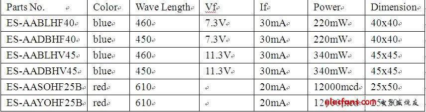 目前只知道***的晶元光電正在生產(chǎn)這種高壓LED,但是在晶元光電的網(wǎng)站上只查到幾種電壓并不太高的HV LED。其指標(biāo)如下表所示: