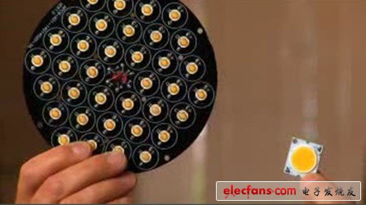 3. “高壓LED減小了LED的面積”,的確如此。例如:對(duì)于一個(gè)36W的LED,如果采用36個(gè)1W的LED那么就會(huì)占據(jù)很大的面積,而如果做一個(gè)集成的36W高壓LED,那么就只要很小的面積(圖3)。這個(gè)看上去是優(yōu)點(diǎn),但如果從散熱的觀點(diǎn)來看就未必是優(yōu)點(diǎn)。因?yàn)榧偃缍叩陌l(fā)光效率相同的話,那么它們將要散發(fā)的熱量是相同的。而在一個(gè)很小的面積里要散發(fā)出大量的熱量,這在散熱器的設(shè)計(jì)中將是一個(gè)大難題。